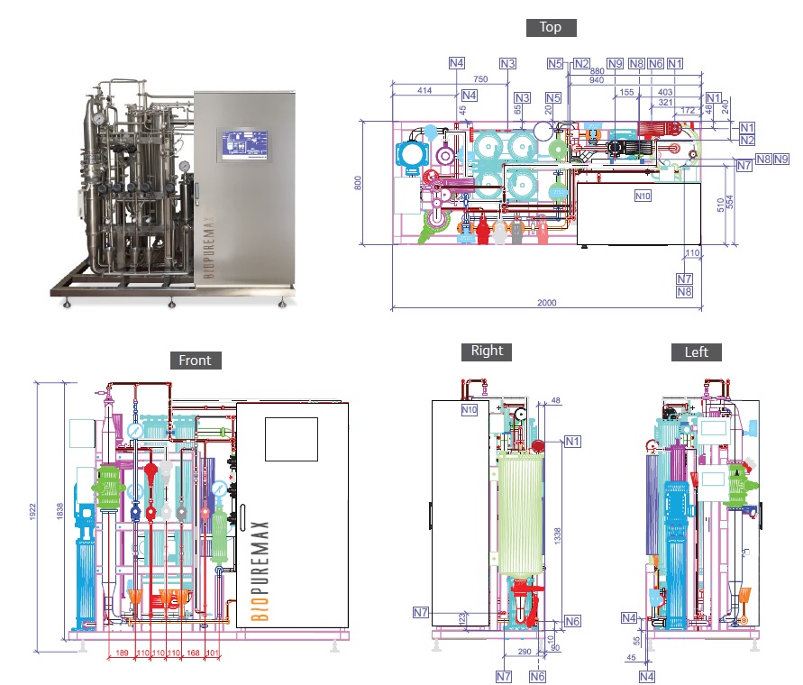 The unit produces 100-250 L/hr (adjustable) with no need for softeners or chemicals.